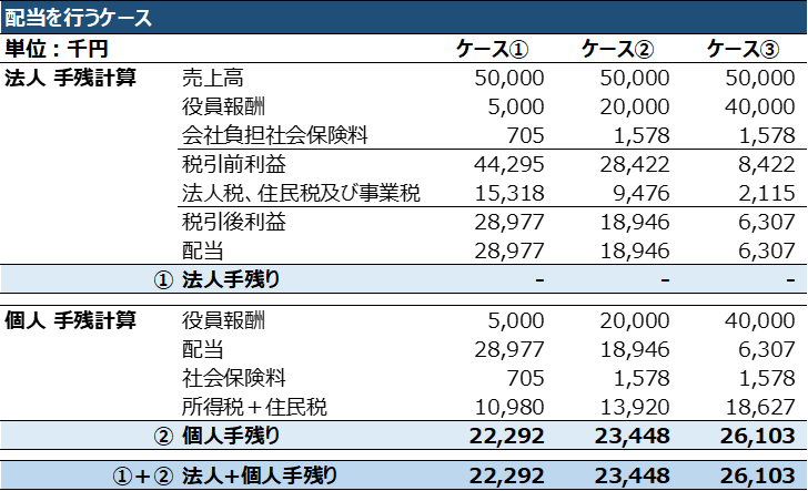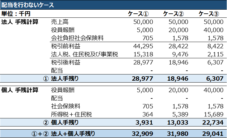 - 役員報酬の金額を、ケース①5,000千円、ケース②20,000千円及びケース③40,000千円の3パターンで比較