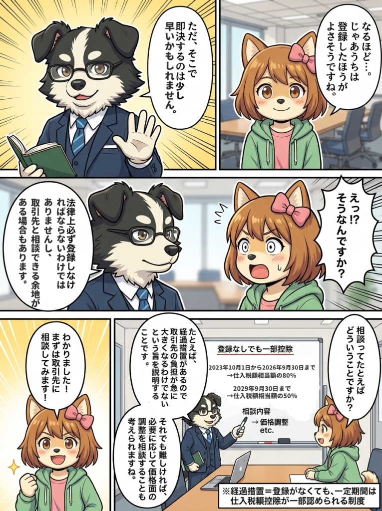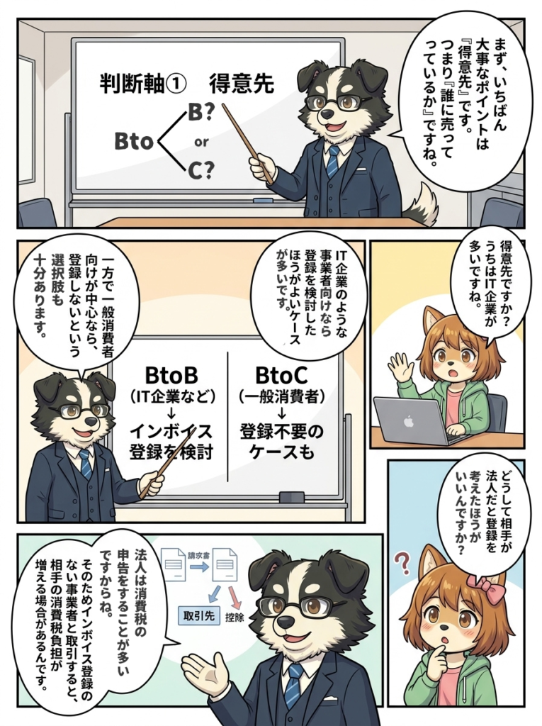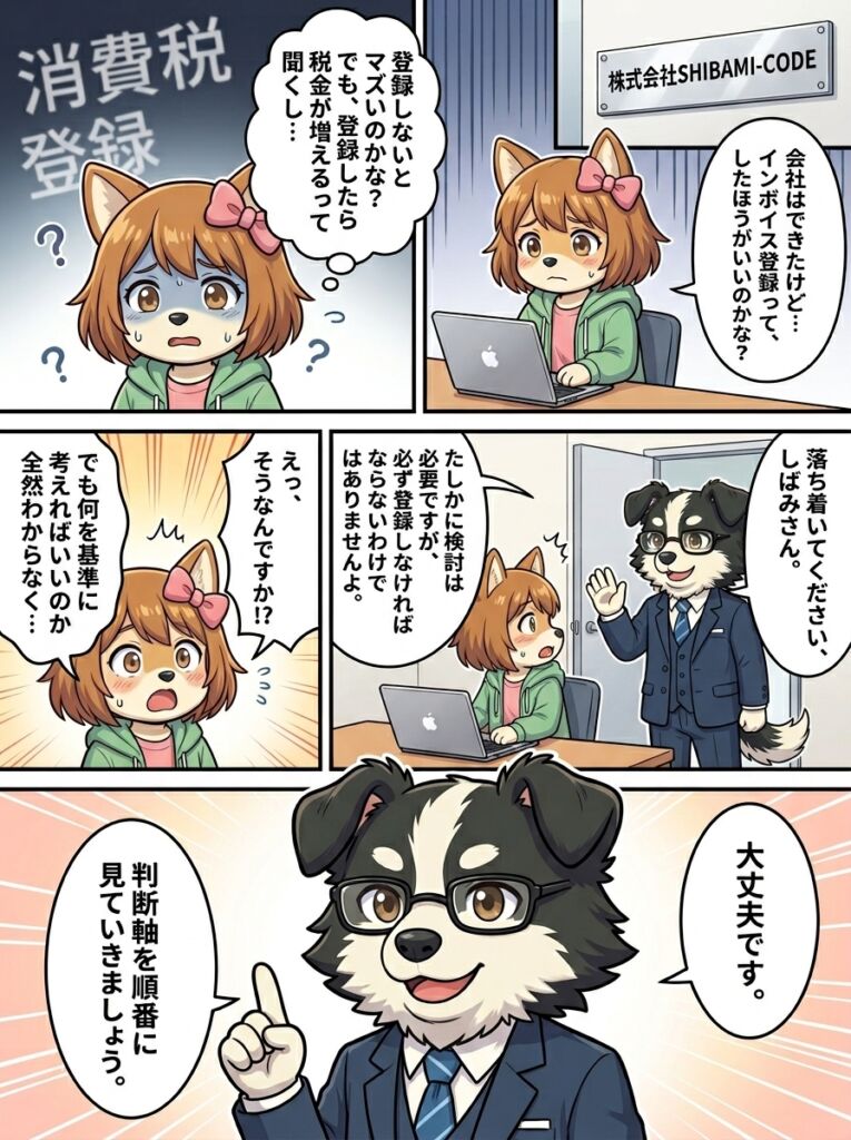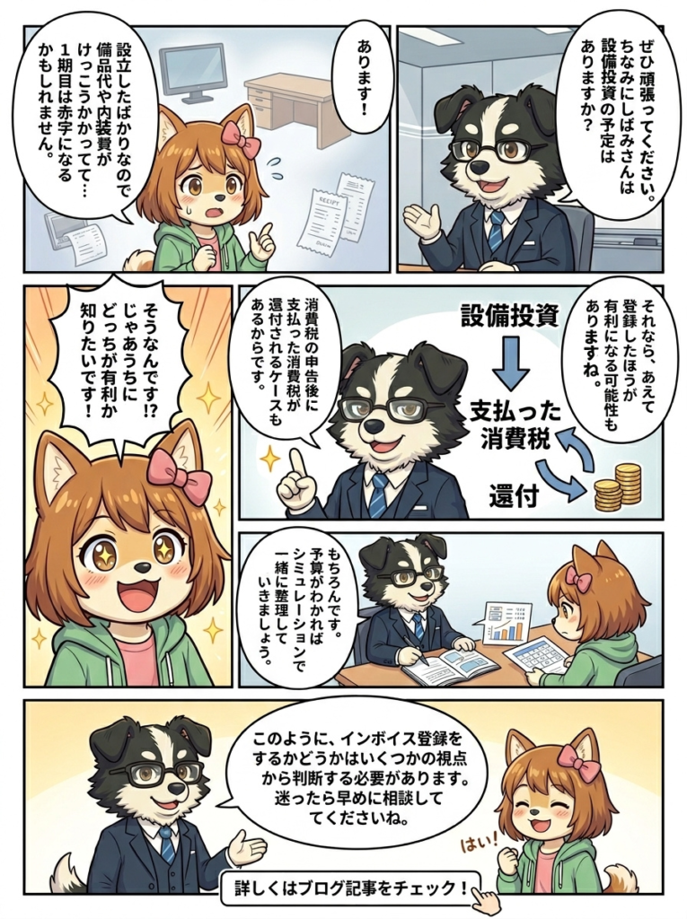 消費税 しばみの奮闘記 しばみの奮闘記②~インボイス登録ってしたほうがいいの?~ 2026.04.22 share インボイス登録すべきかどうか判断するポイントを、AI漫画で解説します! しばみちゃんが法人を設立した直後のお話です。 法人成りしたらインボイス登録は必要?判断基準を税理士が解説 Prev Back